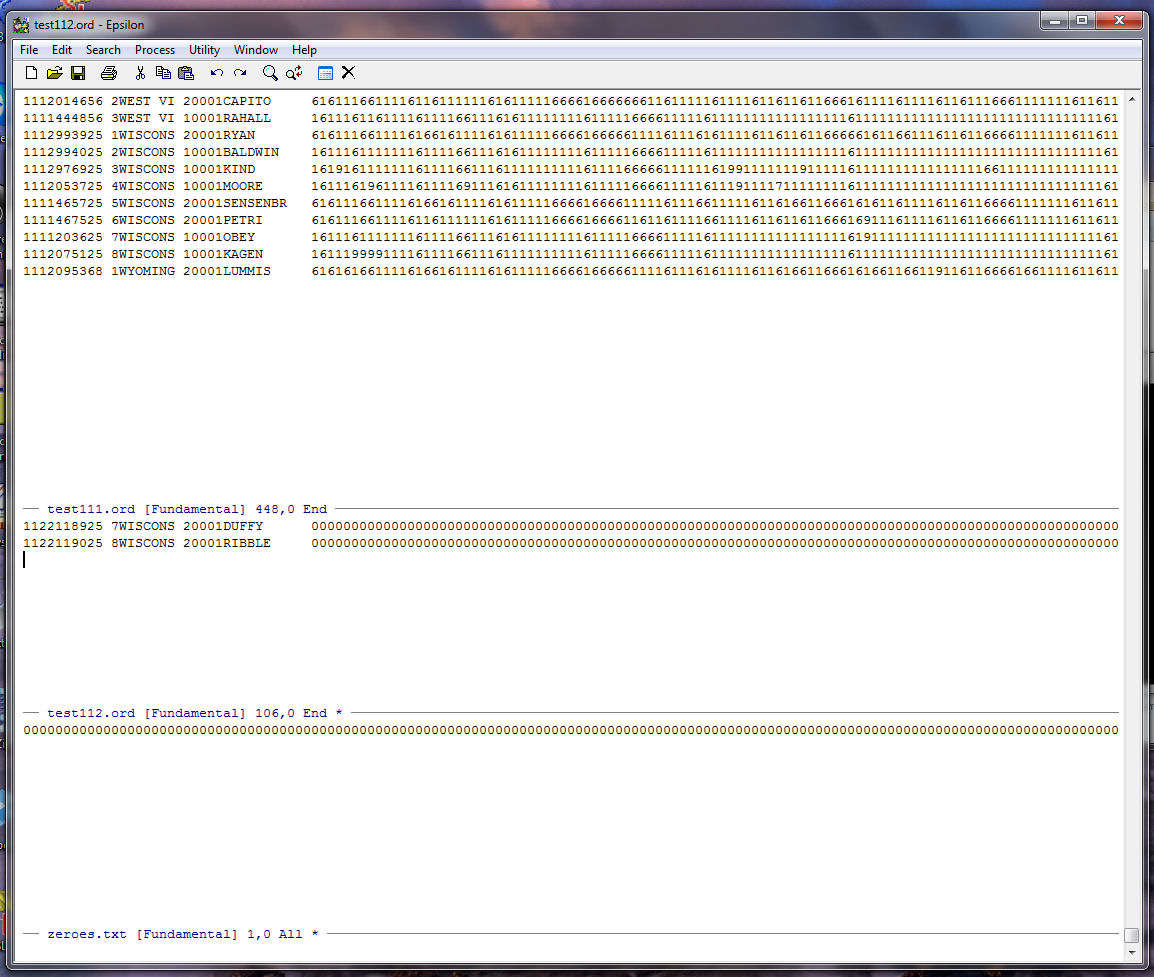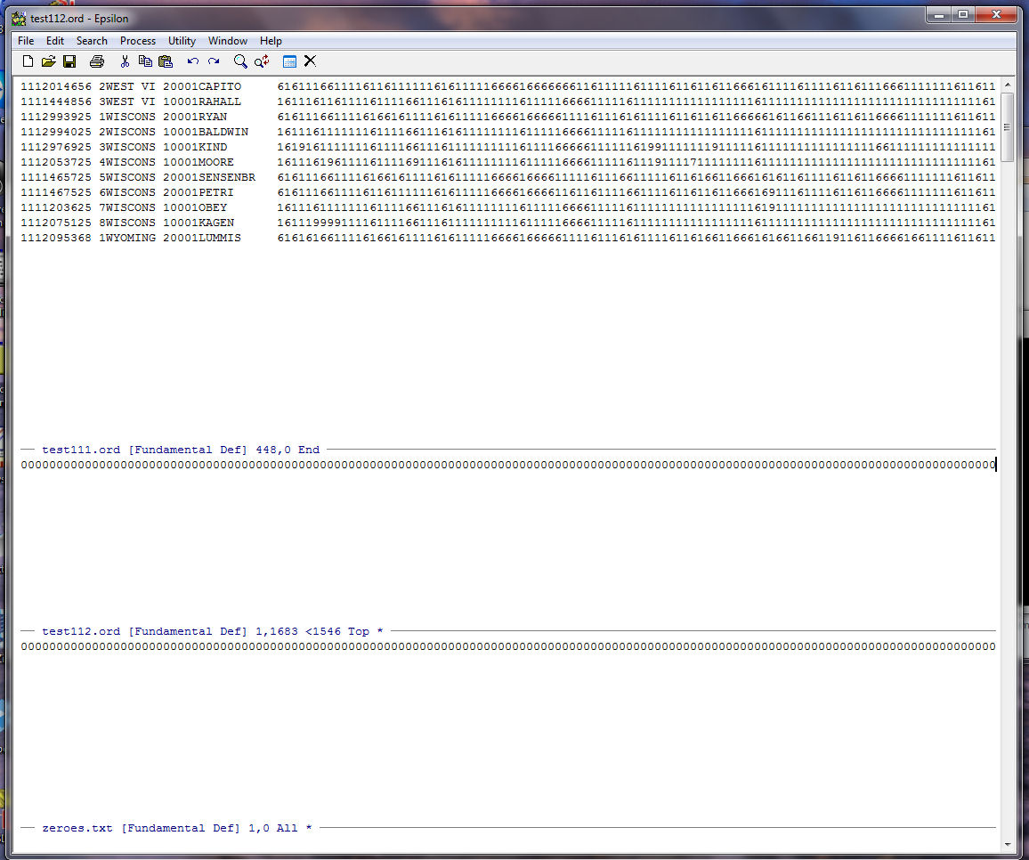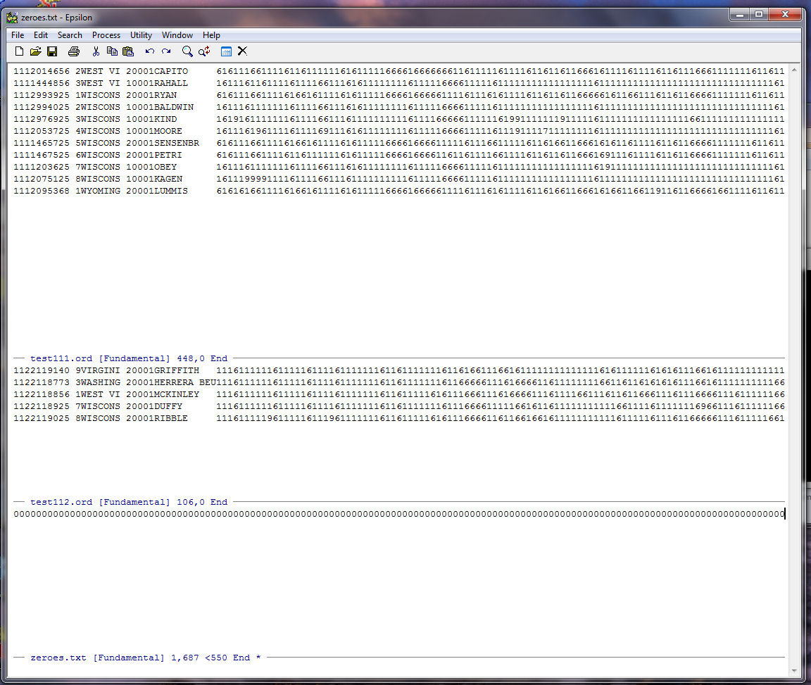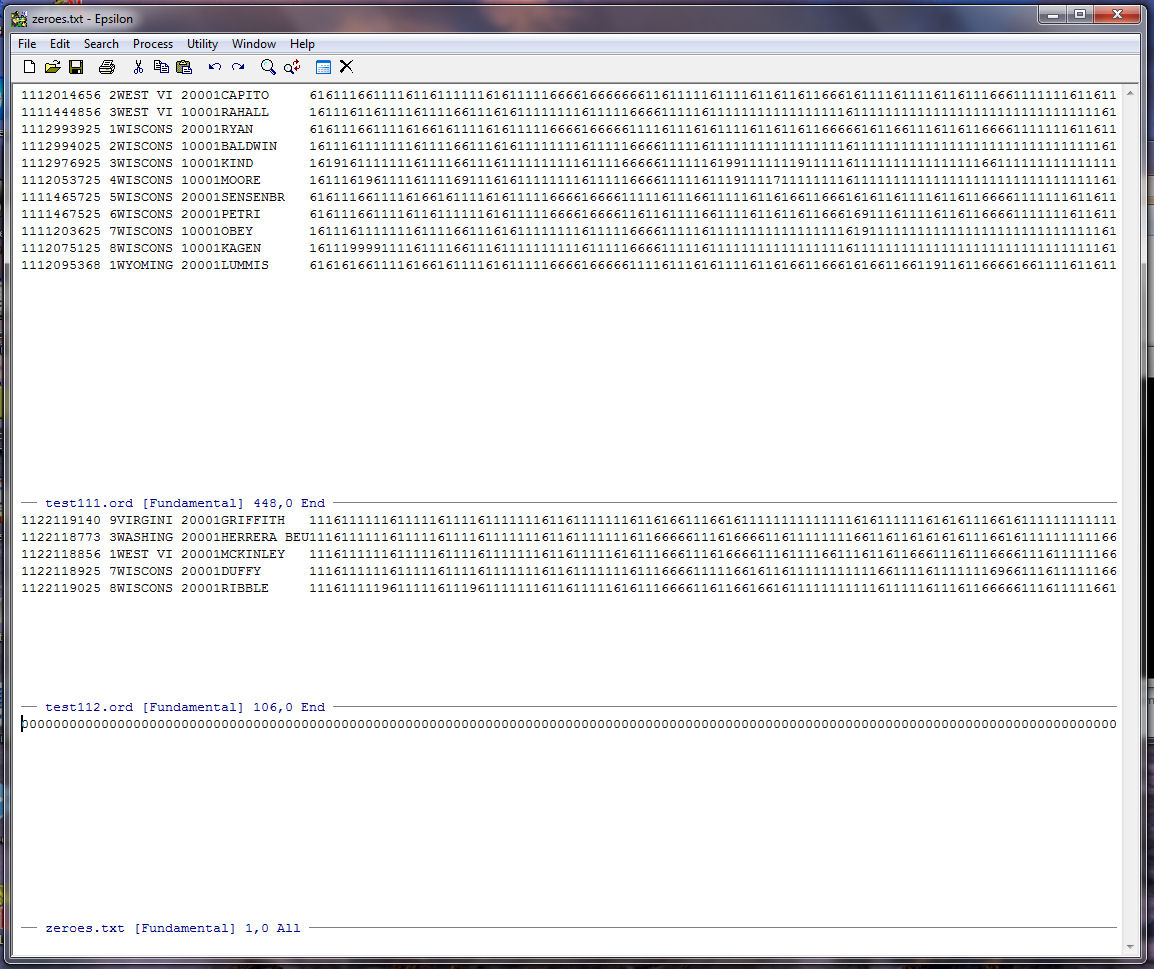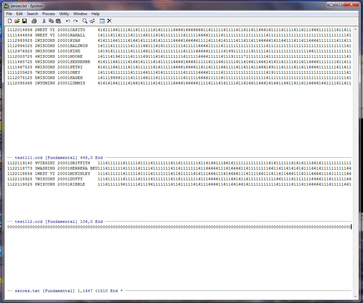 Note that Epsilon tells us at the bottom of the zeroes.txt window that our string of