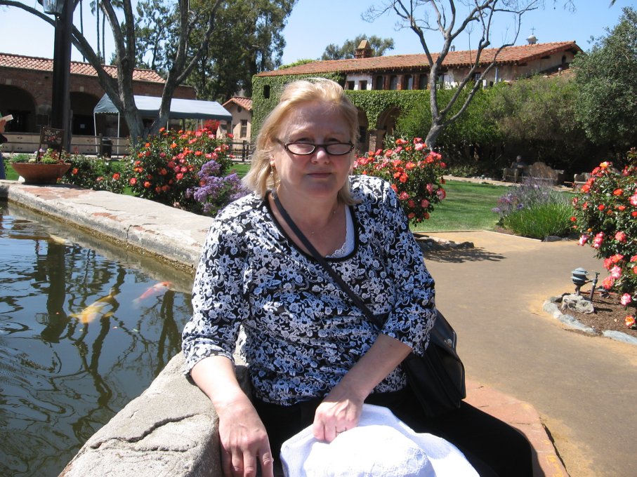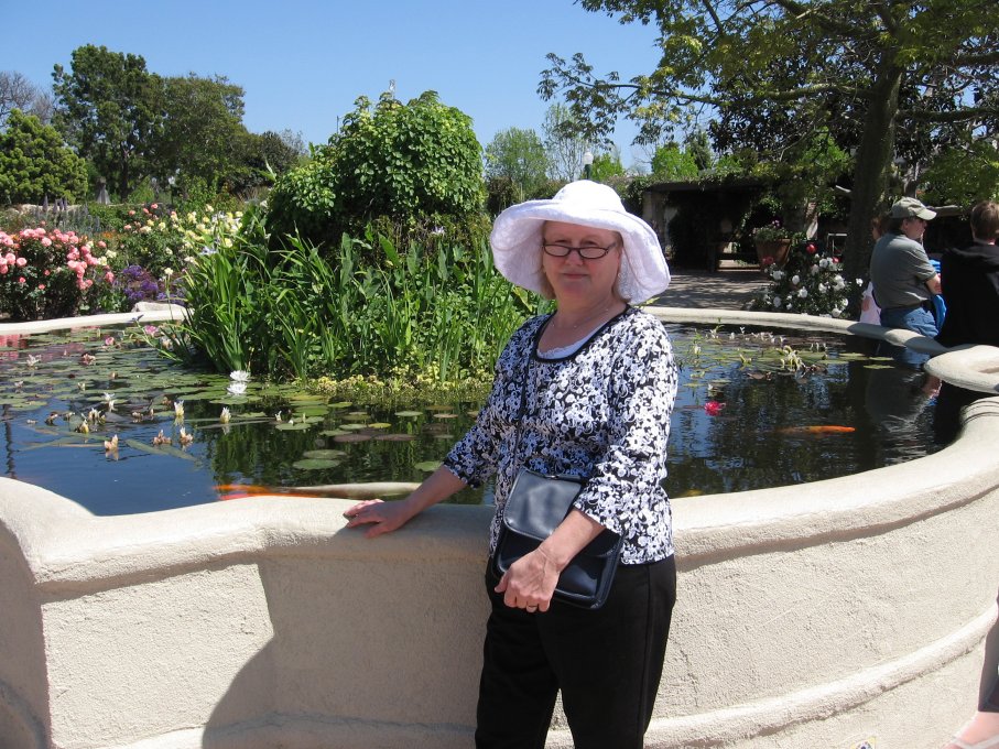 Jan Sitting by the Fountain and Koi Pond in the Interior Courtyard