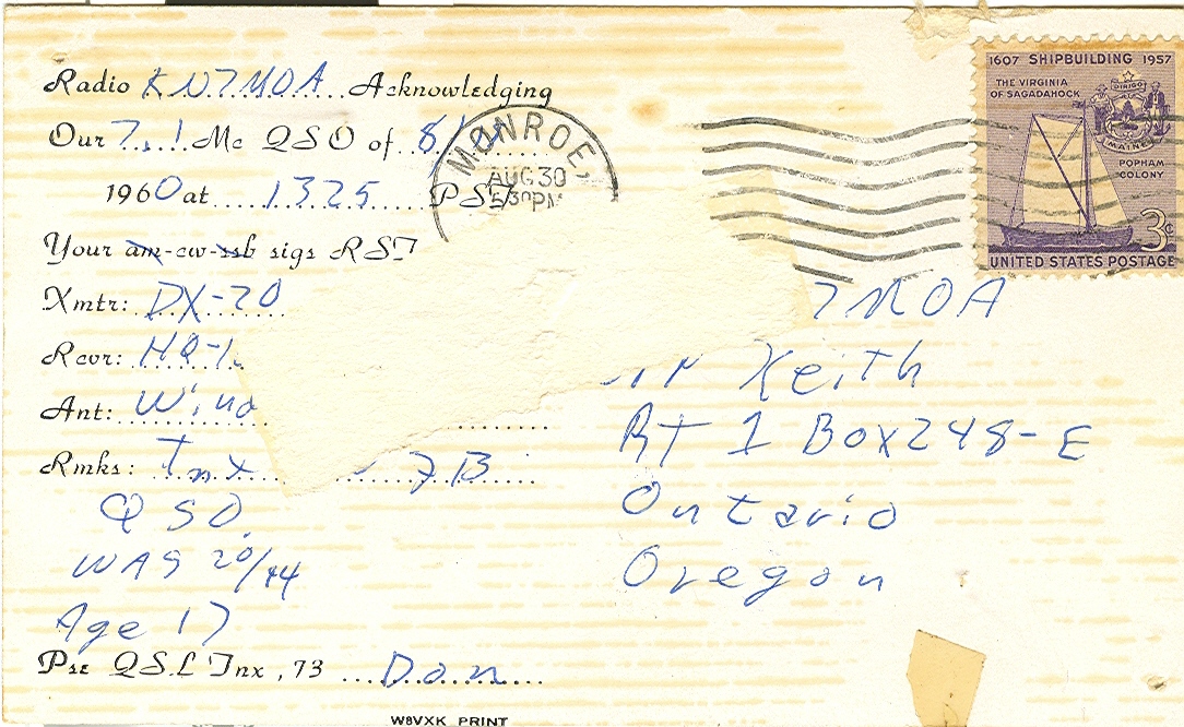 QSL Card for 18 August 1960 QSO with KN7LWO. I was operating from