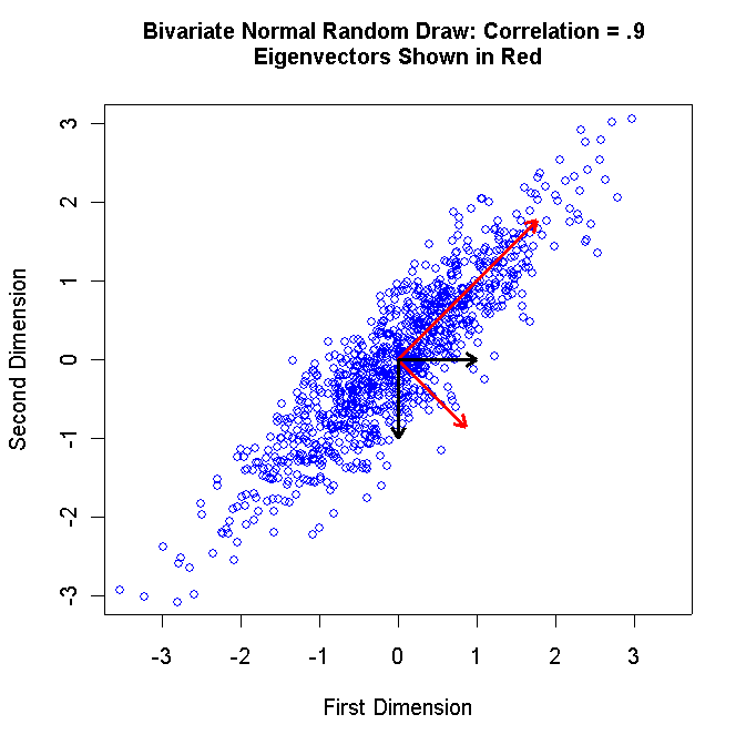 mtext(side=3,line=1.5,"Bivariate Normal Random Draw: Correlation = .9 \nEigenvectors Shown in Red",font=2)