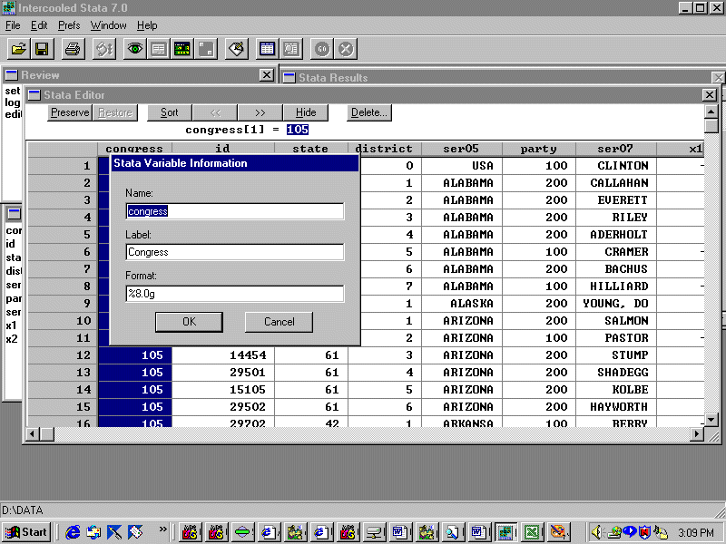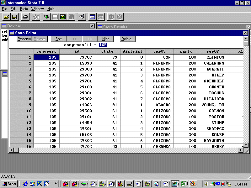 Which pops up a window showing the two variables. Party is the ICPSR ID code for