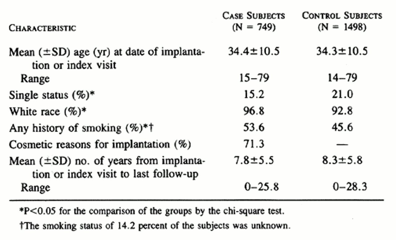 The 749 county residents who received a first breast implant between January 1, 1964, and December 31, 1991 (the case subjects), were followed for 5847 person-years (mean, 7.8 years per case subject). The control subjects from the community included 1498 women who were followed for 12,361 person-years (mean, 8.3 years per control subject). The control subjects with cancer included 306 women with breast cancer who did not receive a breast implant and who were followed for 2703 person-years (mean, 8.8 years per subject). There was little difference in mean age or duration of follow-up between the case and control subjects , but marital status, ethnic background, and smoking history differed significantly.