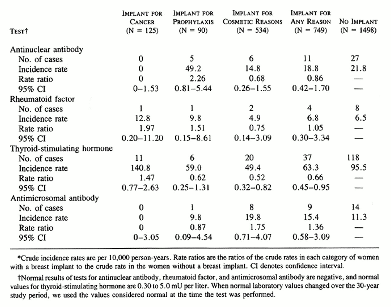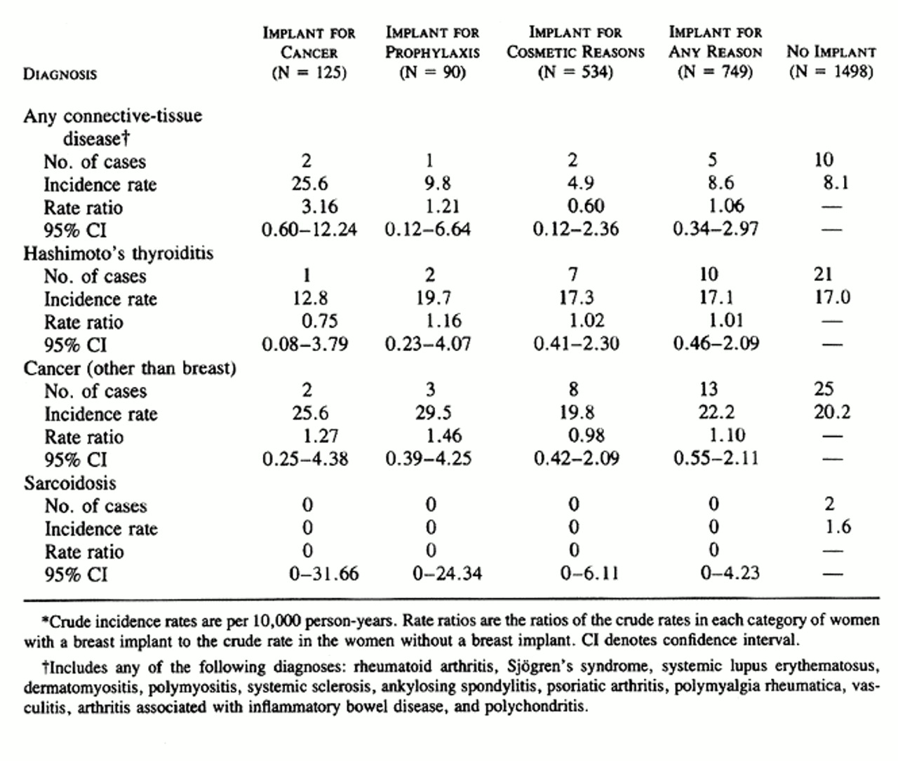 Although our results do not support the hypothesis that women with breast implants have an increased risk of connective-tissue diseases or other disorders, our study has several limitations. First, we had limited power to detect an increased risk of rare connective-tissue diseases, such as systemic sclerosis. Indeed, we calculated that it would require a sample of 62,000 women with implants and 124,000 women without implants, followed for an average of 10 years each, for a doubling of the relative risk of this condition to be detected among women with implants, assuming that the annual incidence of systemic sclerosis is 1.6 cases per 100,000 women36. Our results, therefore, cannot be considered definitive proof of the absence of an association between breast implants and connective-tissue disease. Other controlled studies of this question are ongoing. Their results, together with ours, will help to resolve this controversy.