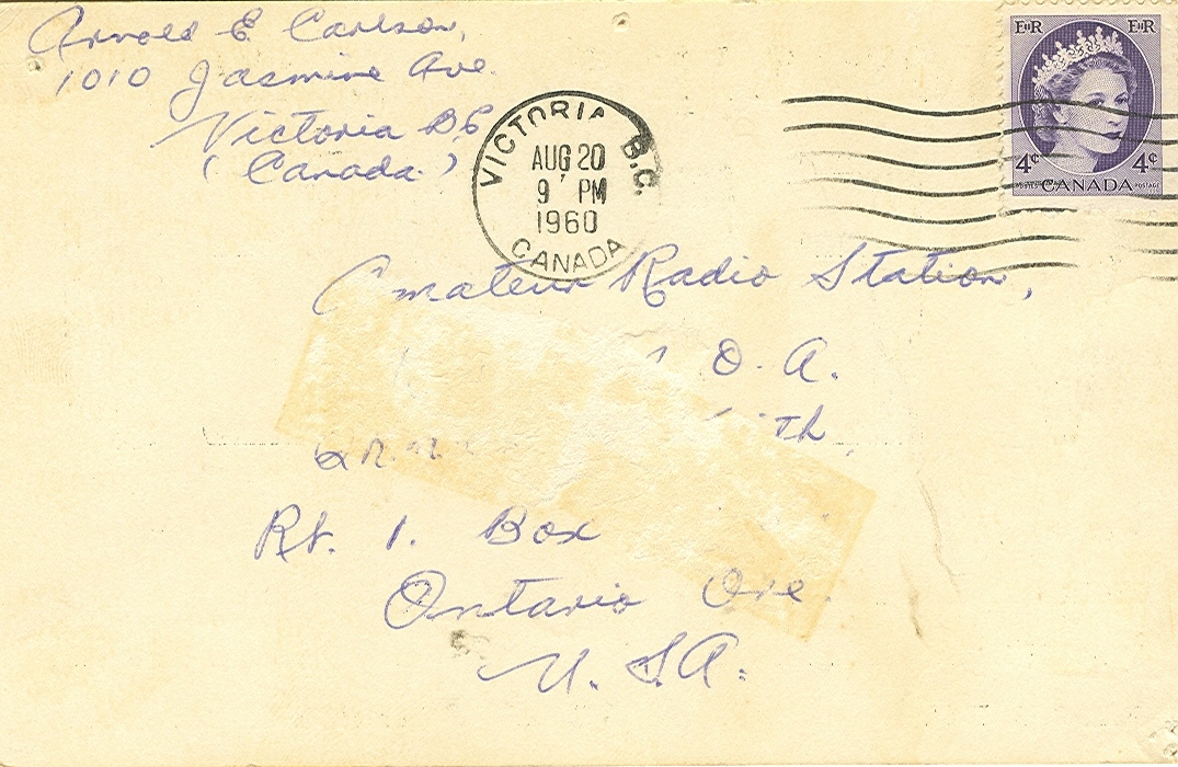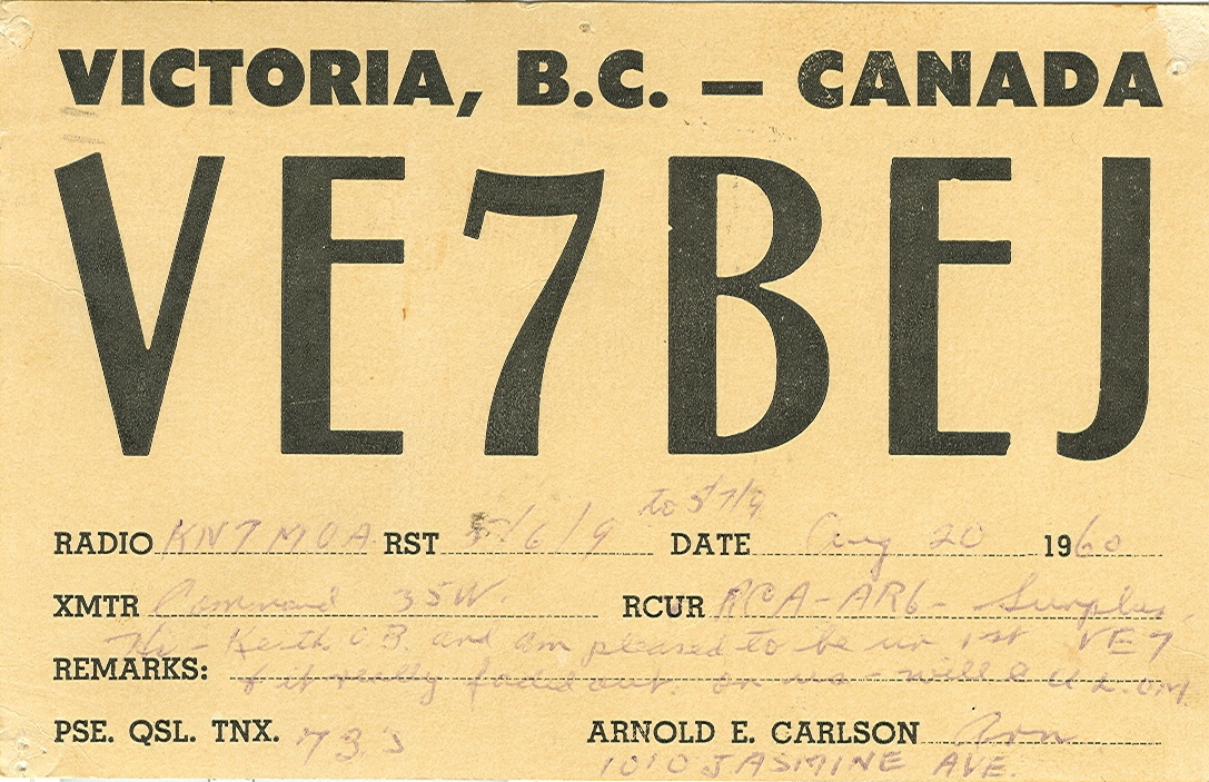 QSL Card for 20 August 1960 QSO with VE7BEJ. I was operating from