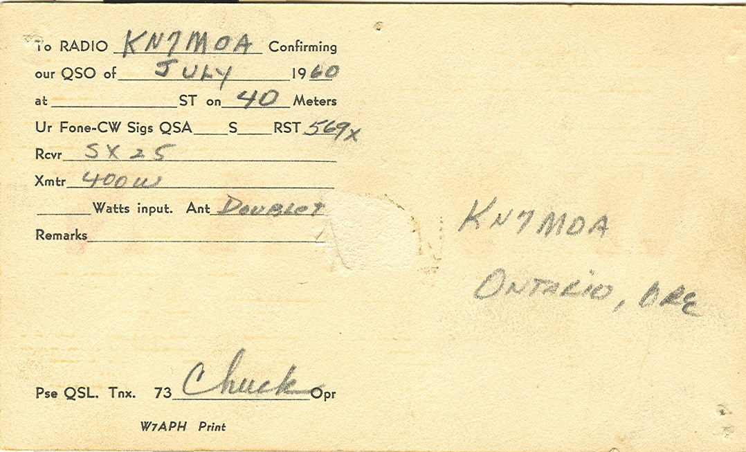 QSL Card for 29 June 1960 QSO with W7IAN. I was operating from