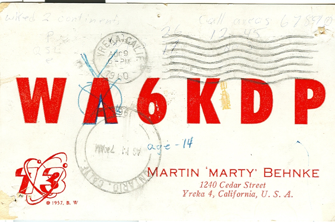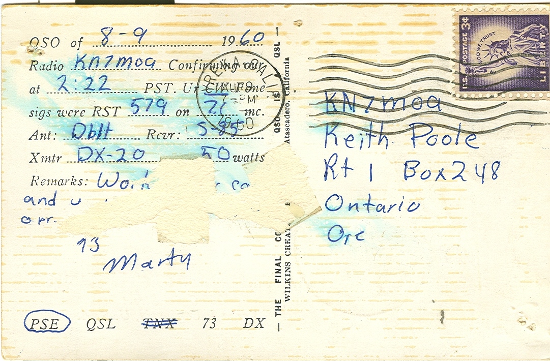 QSL Card for 9 August 1960 QSO with WV6KDP. I was operating from