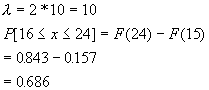 2. Suppose the arrival of customers at a hot dog stand is a Poisson process with an average of 10 customers every 15 minutes. What is the probability that at least 16 but not more than 24 customers arrive in a period of 30 minutes.