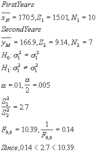 3. Suppose you draw a sample of 10 first year students and measure their heights and obtain the values (in millimeters): 170, 195, 183, 180, 149, 183, 165, 170, 150, 160; and you draw a sample of 7 second year students and obtain the heights: 171, 164, 178, 178, 160, 154, 163. Assume that height is normally distributed in both populations. Test the null hypothesis that the variances of the two populations are the same against the alternative hypothesis that the variances are not the same (a = .01).