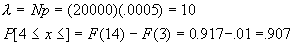 5. Suppose that the proportion of people in the United States suffering from a rare form of cancer is .0005. We take a random sample of 20,000 people. What is the probability that at least 4 but not more than 14 people in our sample have the cancer?