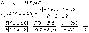 6. A certain electronic system contains 15 components. Suppose that the probability that any individual component will fail is 0.10 and the components fail independently of each other. Given that at least four but not more than eight of the components have failed, what is the probability that at least six of the components have failed.