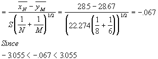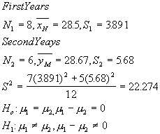 7. Suppose you draw a random sample of 8 first year masters students and find that their ages are 26, 27, 30, 28, 24, 29, 27, 37, respectively; and you draw a random sample of 6 second year masters students and find that their ages are 39, 23, 24, 28, 29, 29, respectively. Assume age is normally distributed in both populations. Test the null hypothesis that the true population mean ages are the same against the alternative hypothesis that the true means are not the same (a = .01).
