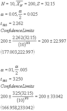 9. Suppose we know that weight in a large population of men is normally distributed. We take a random sample of 10 men from this population and obtain the weights (in pounds): 281, 176, 190, 169, 205, 185, 199, 218, 177, 200. Compute 95% and 99% confidence limits for the true weight, m .