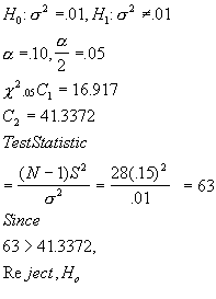 10. A manufacturer of bolts claims that her manufacturing process is very accurate and that the mean length of a certain type of bolt is 20cm with a standard deviation of .1cm. You take a random sample of 29 bolts and obtain a sample standard deviation of .15cm. Assume that the length of the bolts is normally distributed. Test the null hypothesis that the true variance is 0.01 against the alternative hypothesis that the true variance is not equal to 0.01. Do you accept or reject her claim? Use a = .10.
