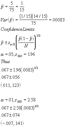 15. A large shipment of capacitors is delivered to our manufacturing plant. We take a random sample of 75 capacitors and find that 5 are defective. Compute 95% and 99% confidence limits for p, the true proportion of defective capacitors.