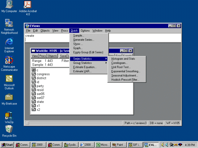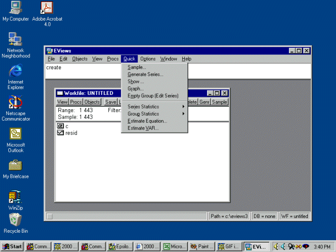 Step one: In EVIEWS select "Quick" on the toolbar (see below)