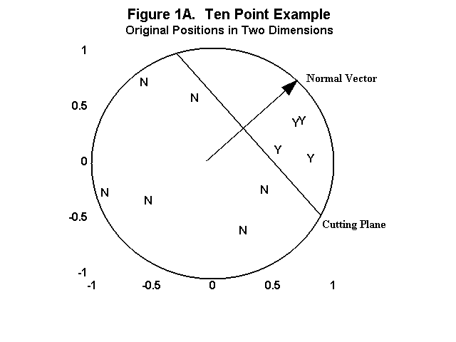 In this context, the problem is to solve for the normal vector, n. (Given n, as shown below, it is simple to find the point on n through which the plane passes.) Let N be the q by s matrix of normal vectors for the q cutting planes. Given the number of dimensions, s, the classification problem consists of finding estimates of X and N, denoted as X* and N* respectively, which maximize the correct classifications.