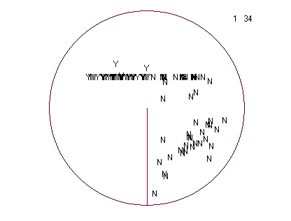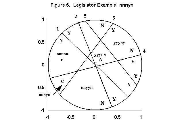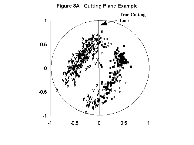 In two or more dimensions this symmetry disappears. For example, in two dimensions, q cutting lines create a maximum of q(q-1)/2 + q + 1 regions (Coombs, 1964, p. 262) with each region corresponding to a voting pattern - e.g., yynnynyn…nn - on the q roll calls. The problem is to place each legislator in a region that best matches the legislator's observed pattern of roll call votes. Given the legislator points, the problem is to find a cutting line for each roll call that divides those legislators voting Yea from those voting Nay such that correct classification is maximized. Solutions for these two problems are shown in the next two sections.