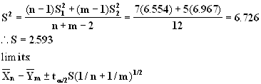 7. Suppose you draw a random sample of 8 first year masters students and find that their ages are 24, 29, 31, 29, 28, 28, 26, 32, respectively; and you draw a random sample of 6 second year masters students and find that their ages are 33, 31, 26, 27, 28, 30, respectively. Assume age is normally distributed in both populations with equal variance. Construct 95% confidence limits for the difference in mean ages of first and second year masters students.