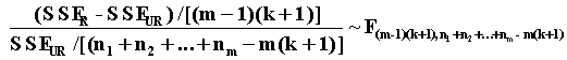 Here m is the number of subsets, SSEUR is the sum of the m separate regressions, SSER is the full regression using all n observations, and (m-1)(k+1) is the number of restrictions (the k+1 b ’s for each subset are constrained to equal one another). Note that this answers question (2) on page V-23 of the Epple Notes.