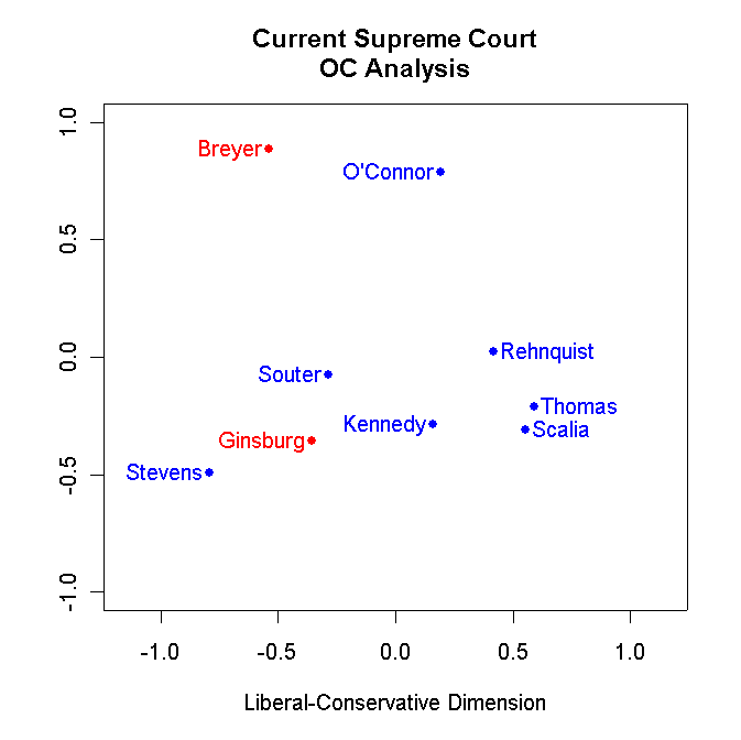 to the voting data for the current Court through 2001. In one dimension OC produces